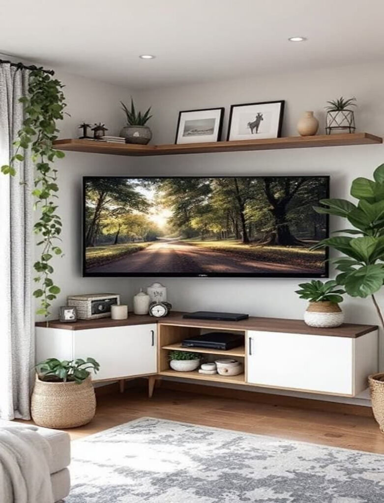 This recreational space blends natural appeal with contemporary design. The TV console’s sleek lines are softened by the greenery in woven baskets and trailing vines, while framed artwork and other décor elements provide a well-balanced, comfortable aesthetic that is both fashionable and welcoming.