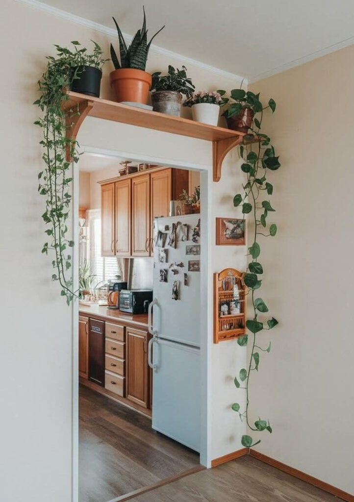 With this kitchen entryway, basic flora becomes an organic design element. A variety of houseplants with trailing vines tumbling down the sides are displayed on a wooden shelf above the doorway, bringing coziness, charm, and a welcome dose of nature into the room.