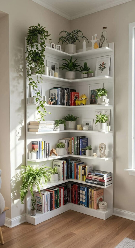 By combining books with plants, this corner bookshelf becomes more than just a place to store books. A straightforward reading nook is transformed into a warm, lively space full of natural beauty and wisdom by the addition of potted plants, tumbling vines, and fresh foliage.