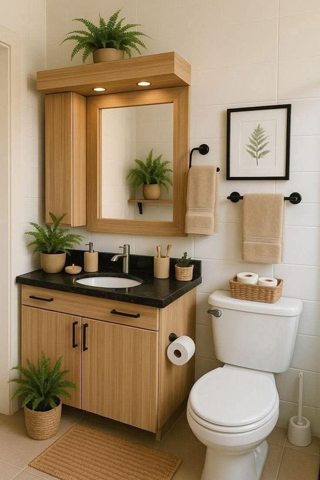 This bathroom’s use of potted plants, soft-toned furnishings, and wooden cabinetry combines practicality with a soothing appearance. Ferns and framed floral artwork add to the room’s airy, spa-like ambiance, making it both useful and welcoming.