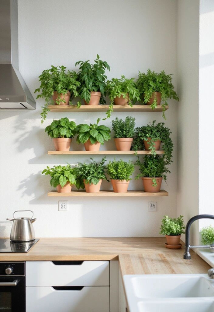 With carefully placed potted herbs on floating shelves, this kitchen corner becomes a vibrant and useful area. Style and functionality are combined by the greenery, which not only adds elegance and freshness but also makes homegrown ingredients easily accessible.