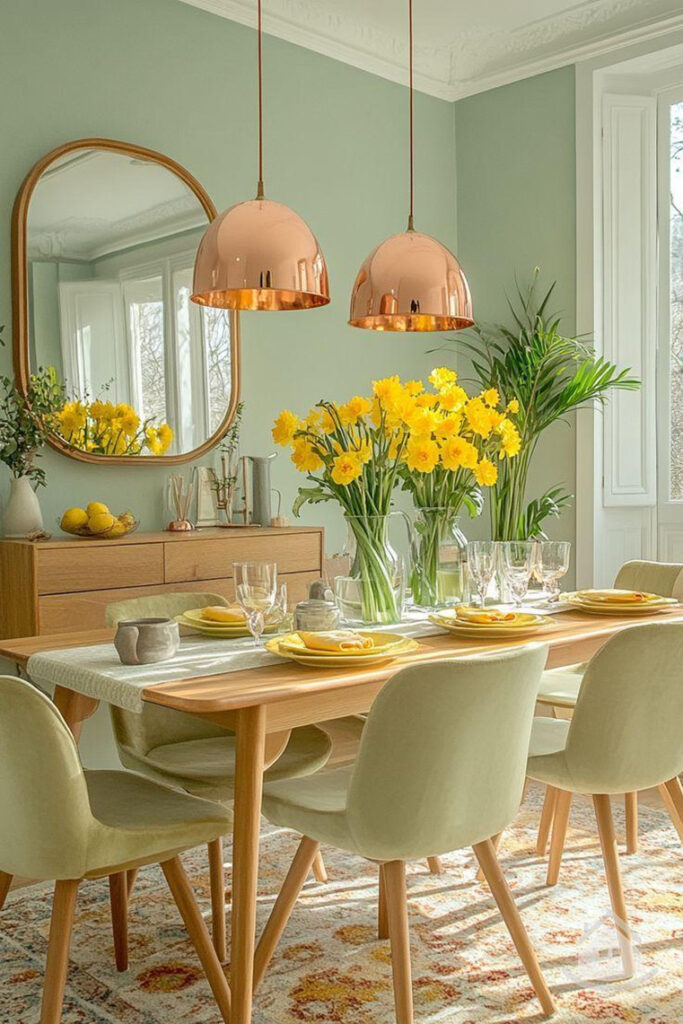 The vivid yellow flowers in clear glass containers fill this dining room with vitality and joy. Soft green walls, cozy wooden furniture, and stylish copper pendant lights all work well with the fresh flowers to create a vibrant yet sophisticated space that is ideal for parties.