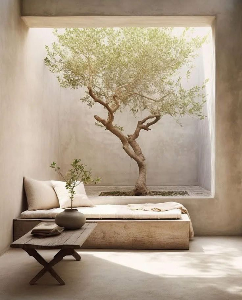 With a single indoor tree serving as the main point, this serene alcove emphasizes the beauty of simplicity. The room is serene and well-balanced, with soft linens, a rustic bench, and natural hues, making it the ideal place for peaceful contemplation or rest.