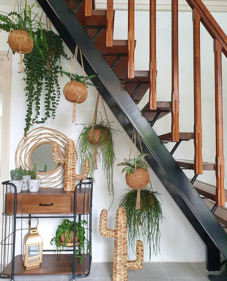 This under-stair area has been converted into a revitalizing nook where design and nature coexist. Wood and rattan accents provide warmth, while trailing flora, woven cactus pieces, and hanging kokedama offer movement and texture. It’s the ideal illustration of how to style a home with natural materials.