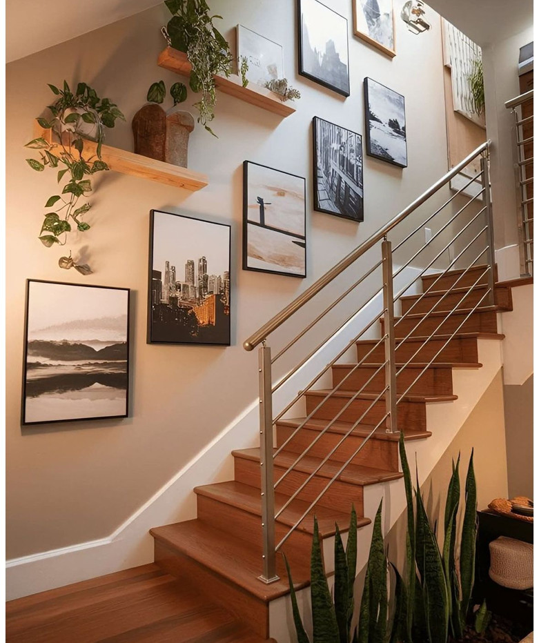 With floating shelves, contemporary framed art, and tumbling foliage, this staircase becomes a focal point. An inviting yet fashionable transition between levels is produced by the harmony of warm wood steps, elegant metal railings, and vertical plants at the foot. An ideal method of turning a plain stairwell into a carefully planned gallery wall with organic embellishments.