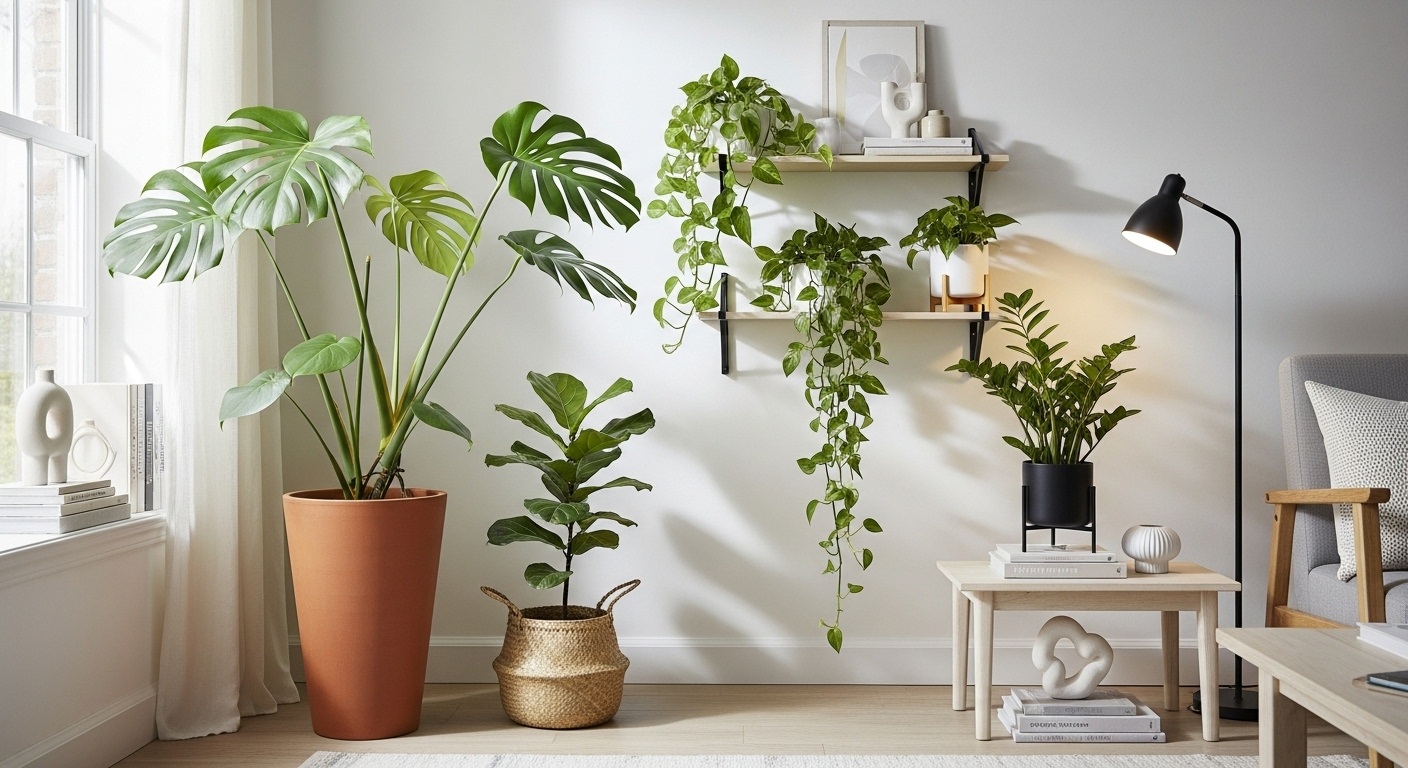 Use these indoor plant decorating ideas to transform your area into a miniature paradise! With its wall-mounted greens and lush corner plants, this comfortable arrangement demonstrates how a little nature combined with rattan furniture can instantly lift the spirits of any house.