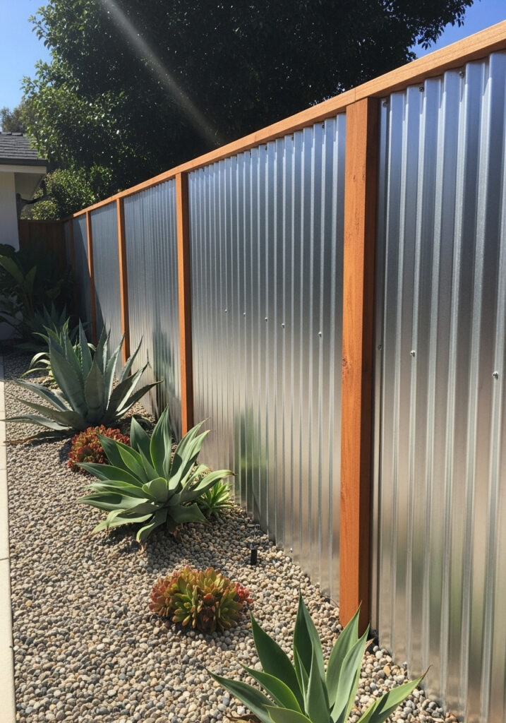 Corrugated metal panels offer durability and a modern-industrial vibe. They resist weather, require little maintenance, and can be paired with wood posts for warmth. Painting or powder-coating the panels adds even more customization.