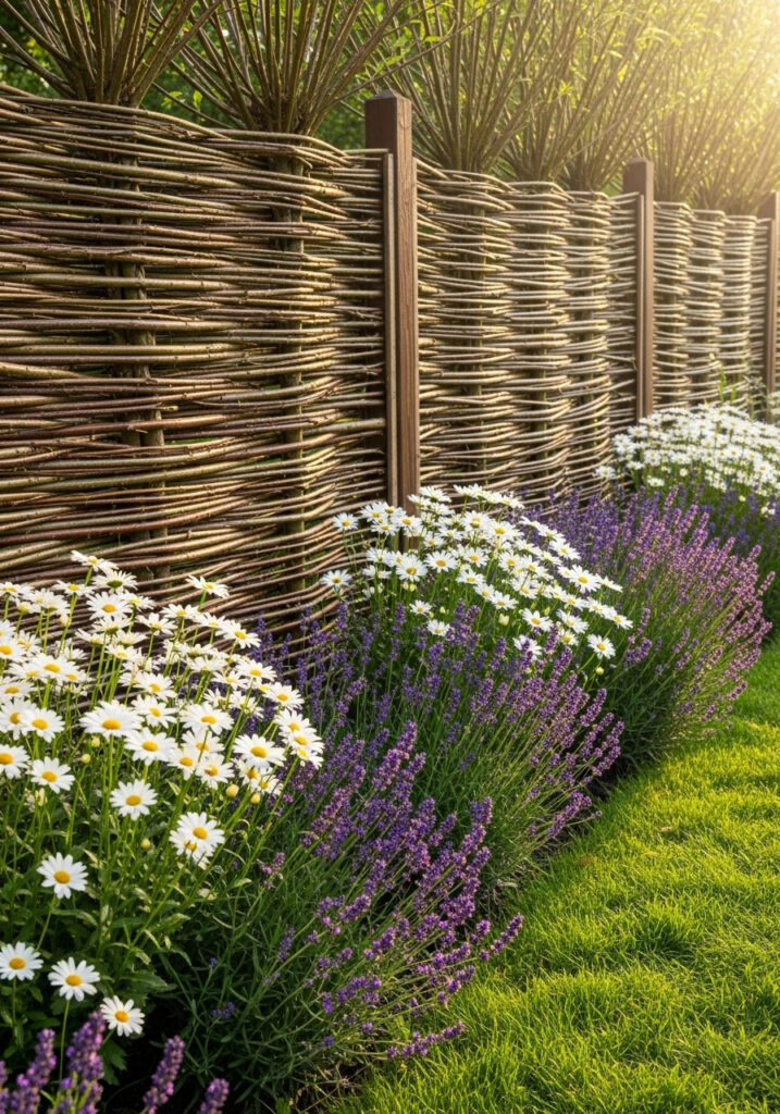 Woven wood fences create a unique, handcrafted appearance. Interlaced wooden slats or branches form a semi-private barrier that allows airflow while maintaining charm. This rustic option pairs well with cottage gardens or naturalistic landscapes.