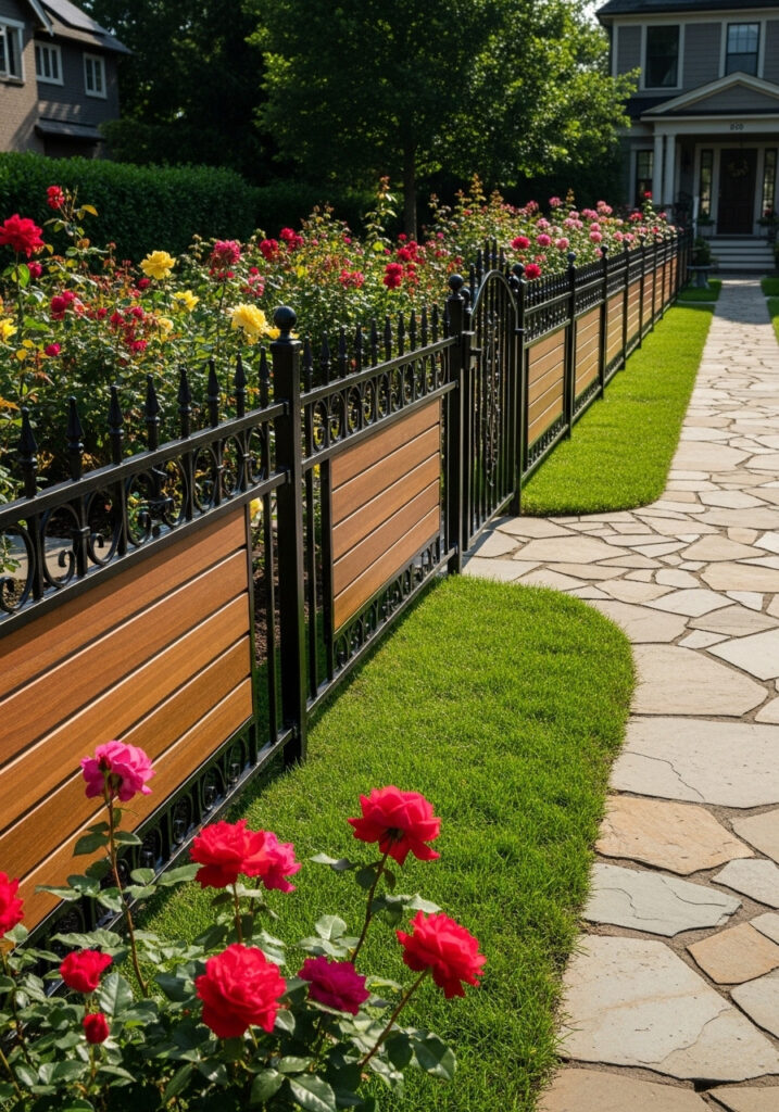 Wrought iron fences provide elegance but little privacy on their own. By adding wood or composite inserts between iron posts, you can achieve both style and seclusion. This hybrid design combines strength with customization.