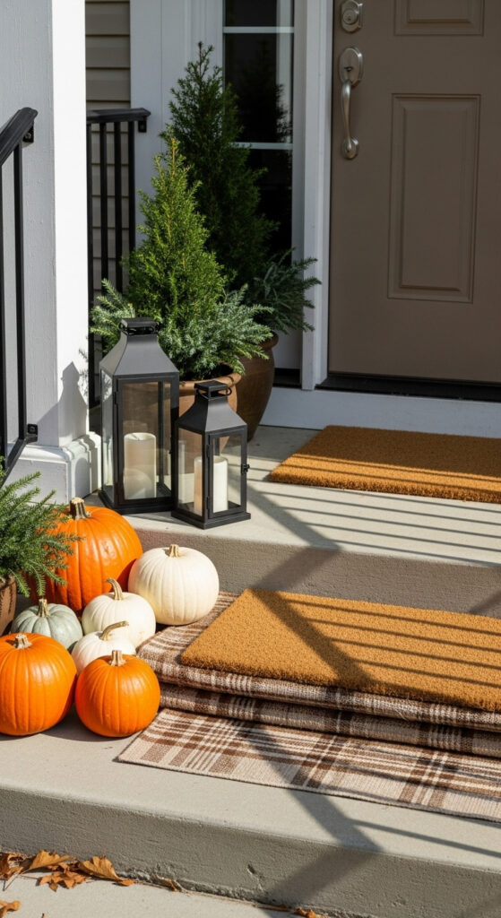 Your porch sets the tone for the whole day. Build a simple arrangement that reads from the sidewalk and still feels fresh up close: a pair of planters filled with clipped evergreen branches and small sugar pumpkins, a dark coir mat layered over a plaid outdoor rug, and two lanterns at different heights near the door. Keep the center of the steps clear for easy footing. If you have a bench, add one folded throw in a deep rust or cinnamon shade. The look is classic, but the restraint keeps it polished—more “seasonal entry” than pop-up farm stand.