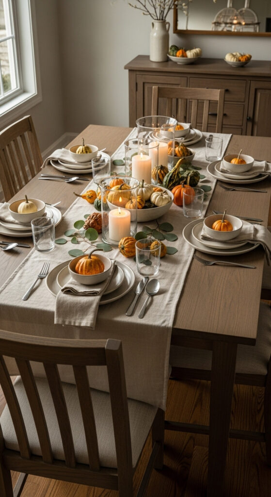 Tall bouquets look dramatic in photos but block eye contact once dinner starts. Build a low, linear centerpiece that lets conversations flow. Start with a textured runner—linen or cotton in oatmeal, caramel, or deep mocha—then cluster low bowls of mixed gourds, a few pillar candles in glass hurricanes, and small sprigs of eucalyptus or bay for fragrance. Keep everything below eight inches. The table will feel abundant without anyone dodging stems. As a bonus, low elements can slide together or apart as platters arrive.