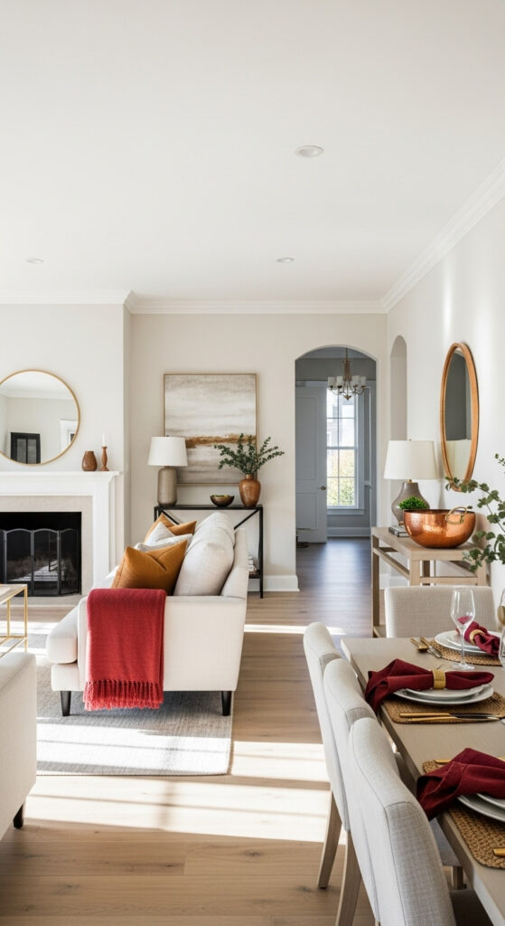 A tight palette keeps your rooms calm even when the house is full. Start with warm neutrals—cream, camel, soft gray—and choose one accent color to repeat in key spots. Deep cranberry feels festive without turning into full holiday red; burnt sienna or copper works beautifully with wood tones. Repeat that accent in napkins, ribbon tails around candlesticks, a ceramic bowl on the console, and a single throw on the sofa. When guests move from entry to living room to table, the spaces will feel connected.