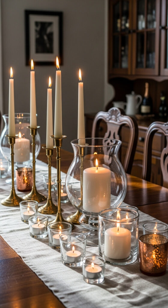 Candlelight does more than set a mood—it hides visual noise and makes textures richer. Mix three types: tapers in sturdy holders for height, pillars in hurricanes for safe glow, and tea lights in heavy glass for sparkle. Keep scents neutral near the table; if you love fragrance, reserve it for the entry. Place candles in clusters of three or five and leave open “landing zones” for platters. You’ll get a layered glow that photographs beautifully and still leaves room for the food to shine.