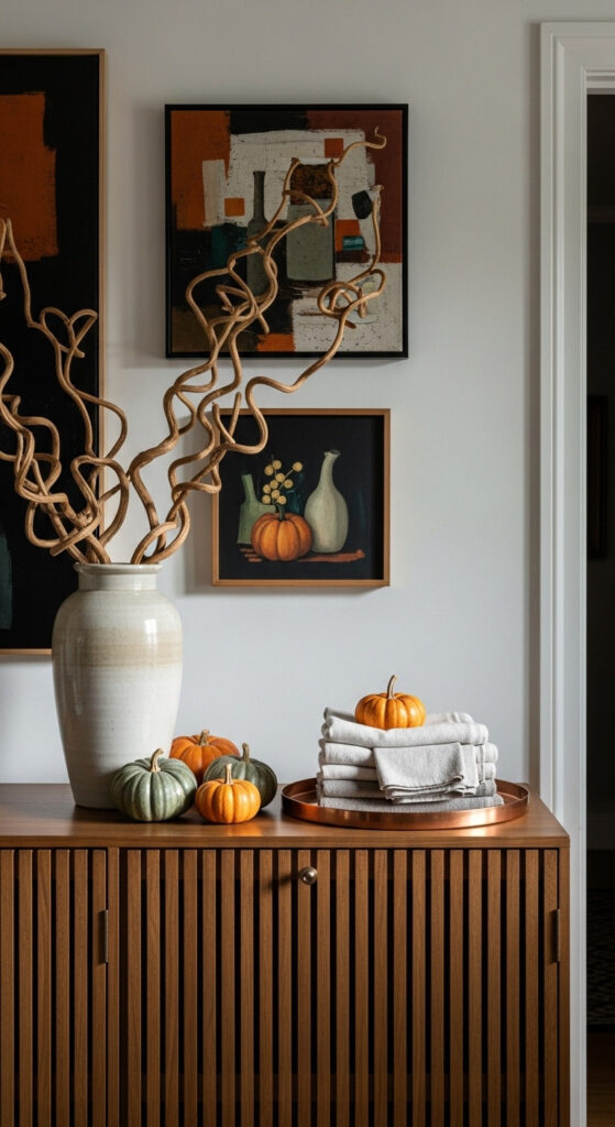 When flowers are pricey or sparse, branches carry the day. Clip a few shapely, leafless branches (or ones with late-season leaves) and stand them in a tall ceramic vase on the sideboard. Ground the vignette with a trio of heirloom gourds, a small copper tray, and a stack of linen towels. The vertical line draws the eye without blocking views, and the materials—ceramic, copper, linen—feel distinctly autumn without shouting. It’s an easy way to bring the season into rooms that aren’t set for dining.