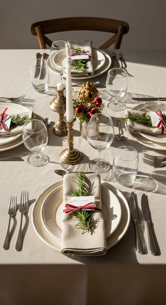 Place cards are small, but they make guests feel seen. Cut thick card stock into simple rectangles, write names in a clean script, and tie each to a sprig of rosemary or bay with a thin velvet or satin ribbon in your accent color. Set cards on the plate or tuck them into napkin rings. The greenery adds a fresh note without crowding the table, and the ribbon quietly repeats your palette. Best of all, it takes minutes and looks like you planned for weeks.