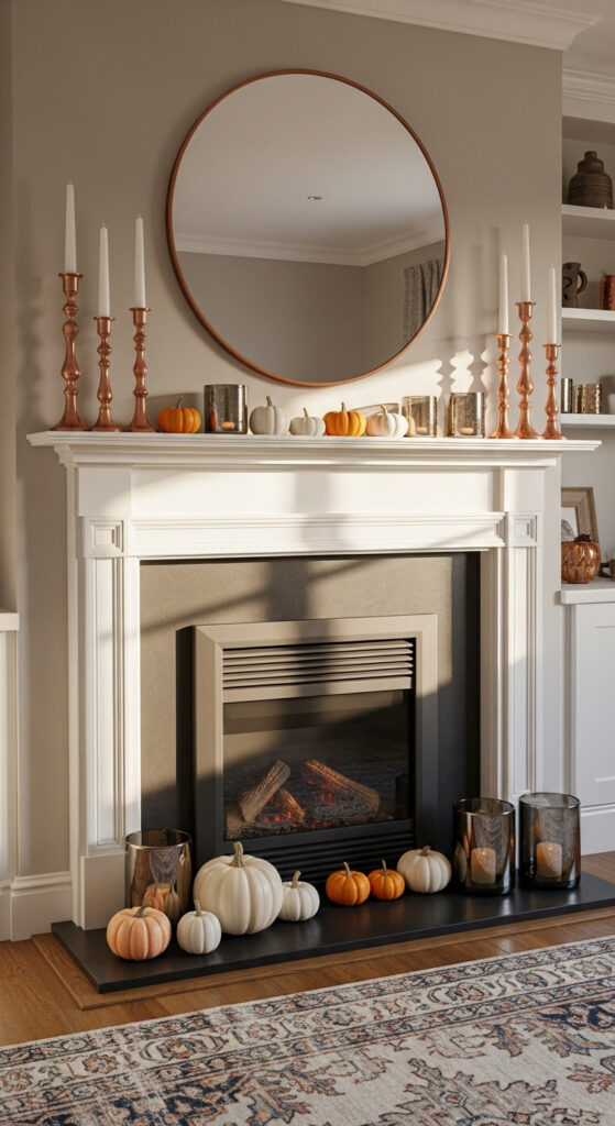 A mantel is the perfect place for a quiet, classy nod to the holiday. Start with a runner of black or deep brown gauze for texture, then line up small white and muted orange pumpkins, mixing in copper candlesticks and a few low votives in smokey glass. Add a pair of framed botanicals or a round mirror above to bounce light back into the room. Keep heights varied but not towering, and leave space between objects so it doesn’t feel crowded.