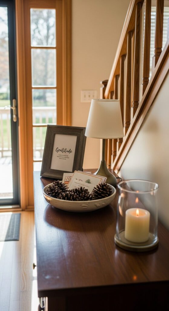 Set a gracious tone as soon as guests step inside. On an entry console, arrange a ceramic bowl filled with pinecones and acorns, a short stack of blank cards with a pen, and a framed prompt that reads, “What are you grateful for this year?” Guests can jot a note and tuck it in the bowl. Add a small lamp for glow and a single taper in a hurricane for height. It’s décor with purpose—quiet, heartfelt, and easy to assemble.