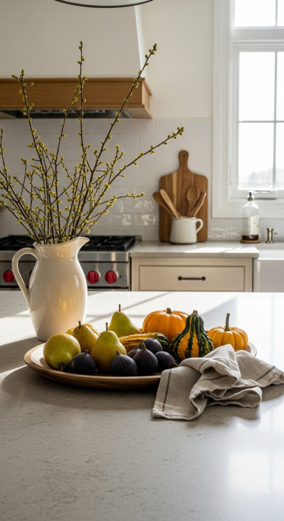 The island is command central on Thanksgiving, so keep décor low, moveable, and truly functional. Place a shallow wooden tray with pears, figs, and small gourds, nestle in a linen towel, and keep a pitcher of branches to one side—far from the workspace. Add a stack of extra napkins and tasting spoons inside the tray so it earns its keep. This small, composed arrangement looks bountiful without stealing prep space when things get busy.