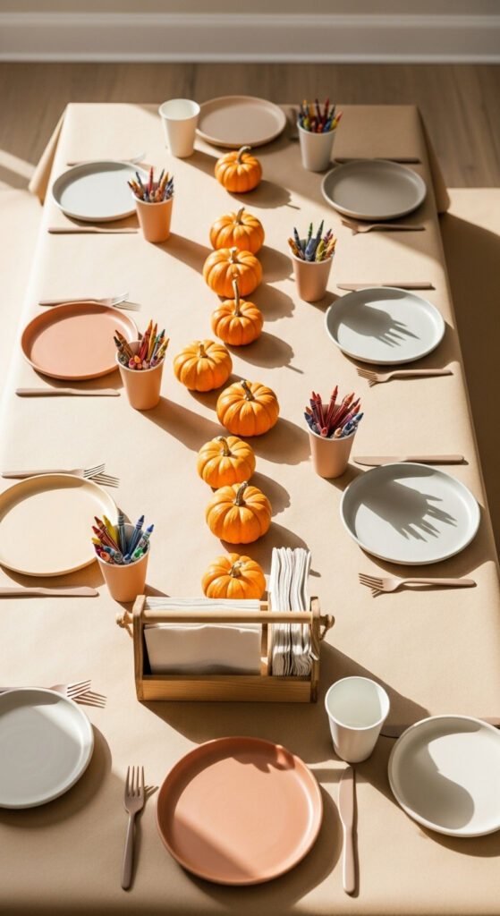 Set the kids up with something charming and mess-friendly. Roll out kraft paper as a table cover, add small cups of crayons, and place a handful of mini pumpkins in the center. Use lightweight, unbreakable plates in a muted color and fill a small caddy with napkins and water cups. The setup looks sweet from a distance, photographs well, and keeps little hands busy while adults plate the meal. When dinner’s over, roll up the paper and the cleanup is done.