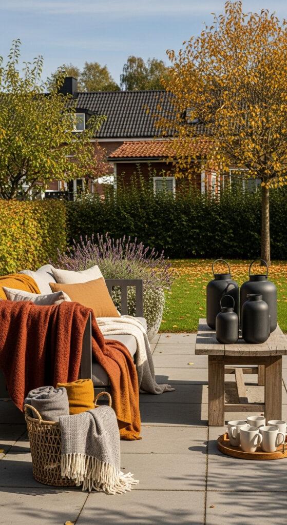 If the weather cooperates, give guests a breath of fresh air. Dress an outdoor bench or sectional with woven throws in russet, cumin, and oatmeal tones, and cluster three lanterns on the coffee table for a cozy glow at dusk. Add a tray with hot cider mugs and keep a small basket of extra blankets nearby. Even ten minutes outside will reset the room’s energy and make the house feel bigger without moving any walls.