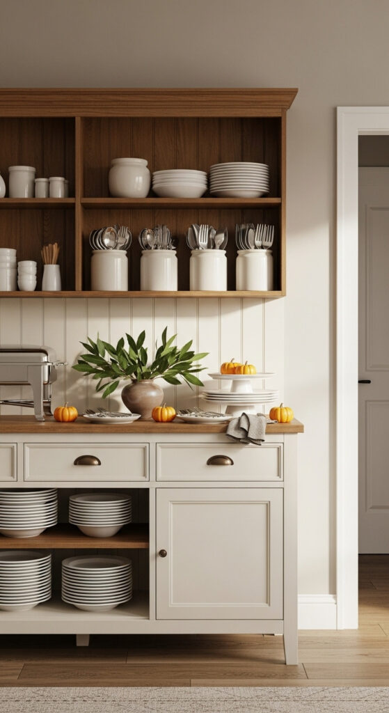 No dining room? No problem. Turn a modest sideboard or even a console into a buffet that looks intentional. Use risers (upside-down bowls, sturdy cookbooks under a towel) to create two levels, set out stacks of plates on the left, and run utensils in small crocks on the right. Slip a few tiny pumpkins and a low vase of bay leaves between serving pieces. The asymmetry feels modern, and the extra height keeps traffic moving.