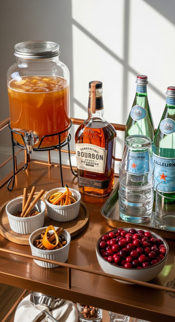 Give your bar cart a seasonal job. Fill a clear dispenser with hot (or room-temp) apple cider, set out cinnamon sticks and orange peel in small ramekins, and offer bourbon or rum on the top shelf with sparkling water below for non-alcoholic mixes. Add a single votive and a bowl of cranberries for color. Label everything with simple tags so guests can help themselves. The cart looks festive, saves you time, and rolls wherever the conversation lands.