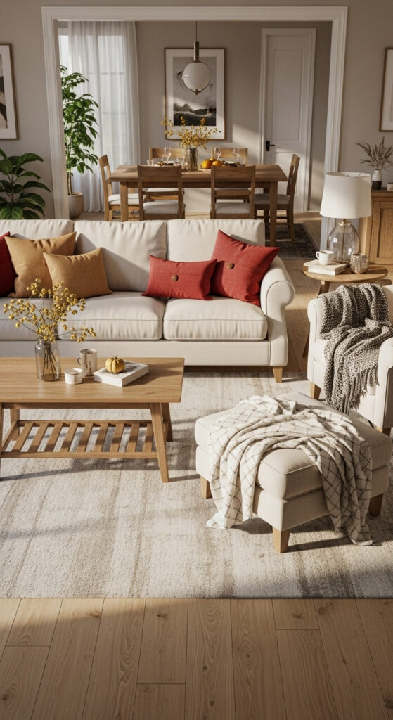 When the meal’s over, everyone drifts to the sofa. Swap in pillow covers and throws that echo your table palette—camel, cream, deep cranberry, or burnt orange—without overwhelming the room. Layer a nubby wool throw over the back of a chair, and add a soft cotton one to the ottoman for chilly toes. Textiles do more than decorate; they soften sound and make open spaces feel intentionally cozy, which is exactly what the day deserves.
